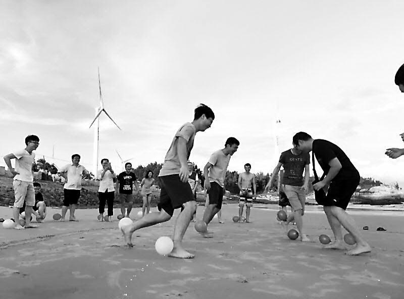 6月30日傍晚,晉江氣電團(tuán)員青年在石圳海灘舉辦“放歌美麗氣電,唱響紅色情懷”紀(jì)念建黨96周年紅歌會(huì)。圖為團(tuán)員青年們?cè)谏碁┥蟻砹藞霾葰馇虮荣愵A(yù)熱。