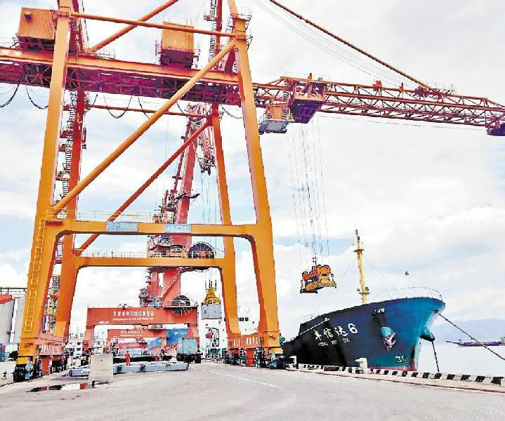 7月9日9時,裝載130標箱的“豐信達6”輪緩緩靠泊肖厝港物流公司4號泊位碼頭。這標志著福州江陰港到肖厝港內貿集裝箱新航線順利試航。據悉,該航線掛靠港口順序為:江陰-后渚-肖厝-江陰,貨源以玉米等糧食為主。圖為“豐信達6”作業(yè)現場。(盧金景攝)