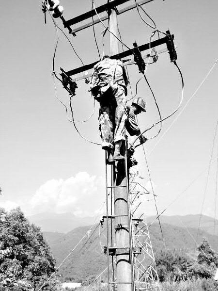 高,火辣辣的太陽照在每個(gè)人的身上,但他們毫不在意,全身心地?fù)屝蘧€路。爬電桿、送工具、重做接線鼻子、接線……每項(xiàng)工作都有條不紊地進(jìn)行著。烈日下,即使汗水濕透了他們的工作服,有的人手臂被橫擔(dān)蹭破皮,雙腳在架子上站得發(fā)麻,但他們?nèi)詧?jiān)持作業(yè)。經(jīng)過1個(gè)多小時(shí)的緊張搶修,半羅山礦二回路線路恢復(fù)供電。