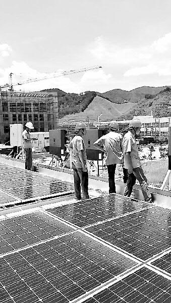 左圖為加快福建南紡高新材料產(chǎn)業(yè)園區(qū)建設(shè),7月17日上午,南紡公司機動維修廠人員在高達(dá)60攝氏度光伏板上的高溫調(diào)試逆變器。(謝明平陳健攝)