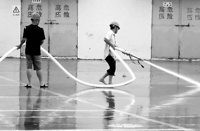上圖連日來,福州地區(qū)多地溫度高達38攝氏度。為了把生產(chǎn)過程中的粉塵排放和污染降到最低程度,建材控股福清混凝土公司清潔工們每天冒著高溫,用高壓水管把工業(yè)廣場沖洗得干干凈凈。(李炳有攝)
