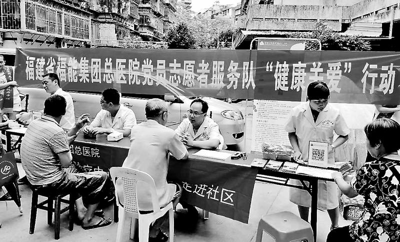 為進一步推進“兩學一做”學習教育常態化制度化,福能集團總醫院黨總支堅持深入開展“主題黨日”活動,教育引導黨員立足崗位作貢獻,更好提升行業窗口服務形象。圖為9月12日上午,該院黨總支組織黨員志愿者進社區開展“健康關愛”義診活動。(李斌鄭麗英攝)