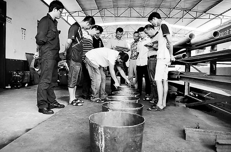比武現(xiàn)場,氣割和電焊閃爍的火花以及錘子敲鐵板的聲響,奏起了強有力的“交響曲”,員工們也給參賽選手們加油助威。(陳愛萍攝影報道)評委給選手制作的喇叭口打分。