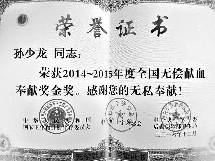 ????孫少龍2017年獻血榮譽金獎證書遙 一個偶然的機會,南紡公司員工孫少龍看到論壇“閩北互動”上的一個志愿欄目,很欣喜地報了名。就這樣,孫少龍開始了他的義工之行。