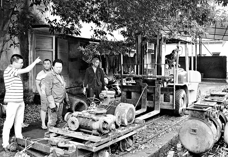 連日來,銅鑼坪礦對井口工業廣場機修車間堆積的報廢機電設備進行集中整理,將這些設備調運回倉庫,還井口工業廣場一個整潔的環境。圖為10月17日上午,叉車在調運井下小型報廢抽水設備。(陳思忠攝)