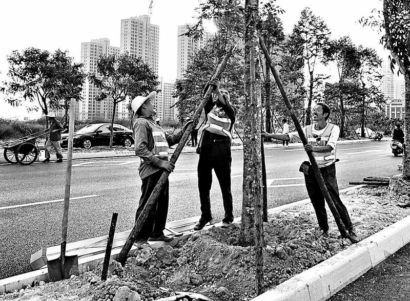 為進(jìn)一步加快推進(jìn)詔安縣城區(qū)主干道改造工程PPP項(xiàng)目南環(huán)城路景觀工程施工進(jìn)度,省城投公司詔安項(xiàng)目公司統(tǒng)籌協(xié)調(diào),組織各參建單位以建設(shè)示范路段工程為著力點(diǎn),進(jìn)一步推進(jìn)工程施工進(jìn)度。圖為10月27日,工人們對(duì)剛栽種的苗木進(jìn)行加固。(黃祝愿 攝)