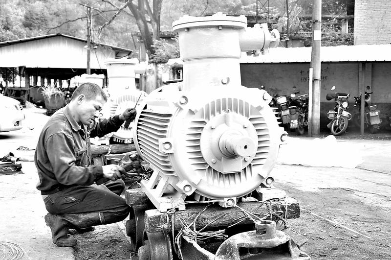 上圖福建煤電公司銅鑼坪礦根據(jù)國(guó)家明令禁止使用淘汰設(shè)備的要求,將該礦延五采區(qū)+20水泵房三臺(tái)沒有防爆的三相異步電動(dòng)機(jī)更換成新型的隔爆型三相異步電動(dòng)機(jī)。圖為12月12日,機(jī)修人員對(duì)下井前的水泵電機(jī)底座進(jìn)行加固。