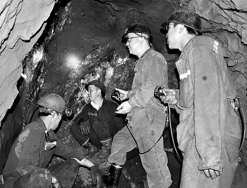 2018年的第一天,天湖山能源公司含春煤礦安全管理人員到井下進(jìn)行安全檢查。圖為該礦生產(chǎn)副礦長(zhǎng)吳雄猷(左三)和生產(chǎn)辦技術(shù)員林培利在井下工作面檢查安全,并向作業(yè)人員宣傳“保安全、保出勤、保產(chǎn)量”“三保”勞動(dòng)競(jìng)賽相關(guān)獎(jiǎng)勵(lì)措施。(吳曲彬攝)