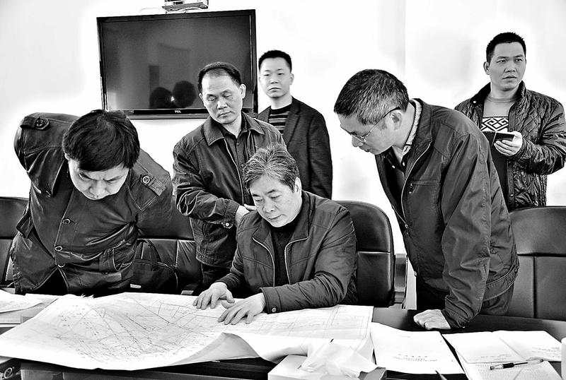 2017年12月29日,省經(jīng)信委能源處副處長王鴻皆(前排中)到含春煤礦進行防治水督查,圖為他正在查看該礦水文地質圖。
