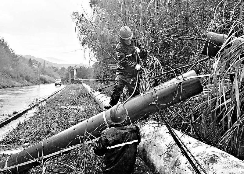 右圖1月7日,福建煤電供電公司轄區(qū)一桿塔受暴雨沖擊,發(fā)生傾斜倒塌。災(zāi)害發(fā)生后,該公司立即啟動應(yīng)急預(yù)案,迅速組織搶修人員趕赴現(xiàn)場開展搶修。搶修人員經(jīng)過3個多小時的奮戰(zhàn),終于恢復(fù)了正常供電。