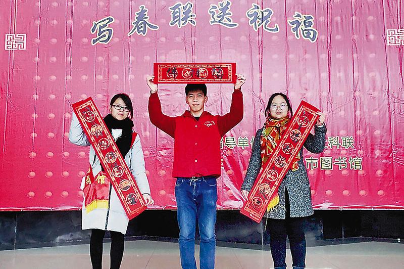 2月3日上午,聯(lián)美集團(tuán)公司組織3名青年志愿者參加廈門(mén)市圖書(shū)館主辦的“寫(xiě)春聯(lián)送祝福”新春對(duì)聯(lián)歡樂(lè)送活動(dòng)。志愿者們積極宣傳福能集團(tuán)文化,邀請(qǐng)現(xiàn)場(chǎng)書(shū)法家為當(dāng)?shù)鼐用褓?zèng)寫(xiě)“福相伴”新春對(duì)聯(lián),受到廣大居民的熱烈歡迎。
