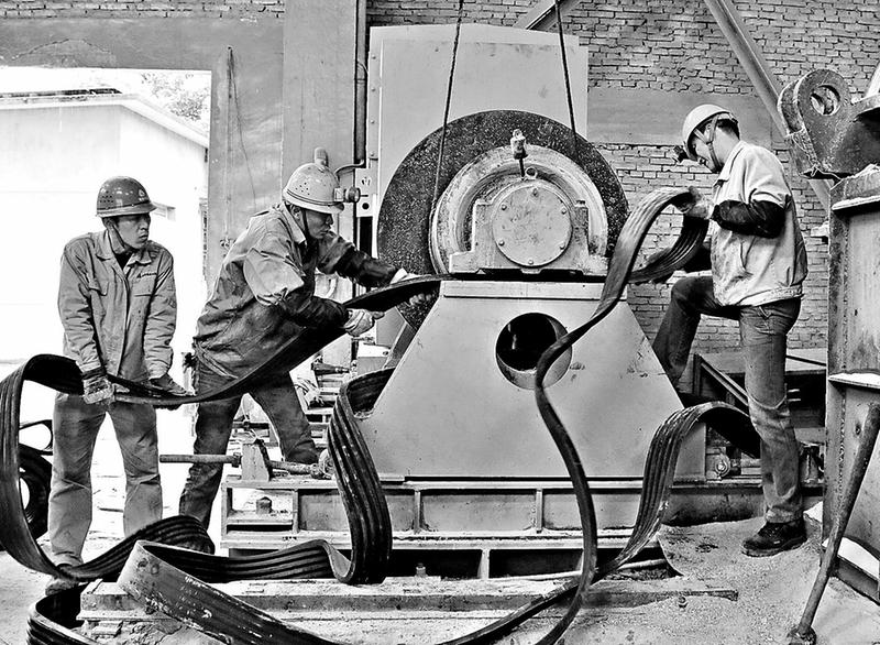 今年大修涉及工藝、機械、電氣、余熱發(fā)電等專業(yè)的40多個主機設(shè)備項目。工期安排分熟料和水泥兩條主線,熟料線大修計劃開工日期2月23日,計劃工期17天。圖為員工們正在更換石灰石破碎主電機送動皮帶。