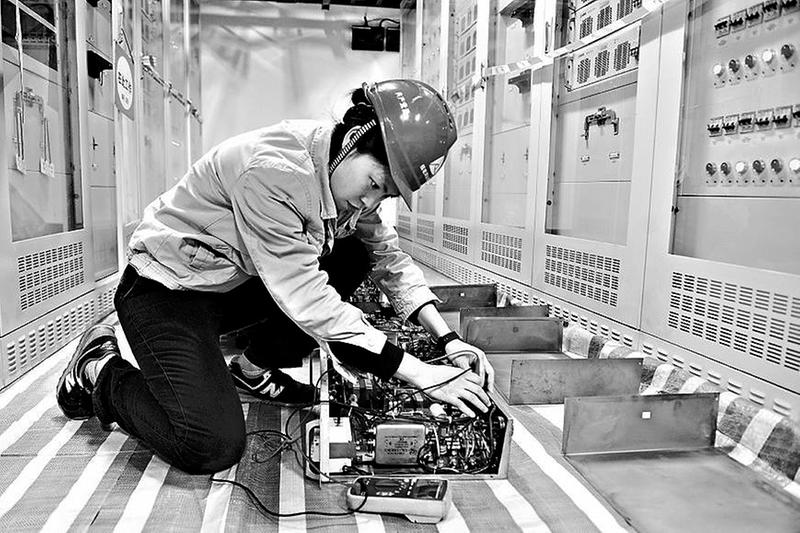 (邢睿攝影報道)陳梅正在檢查直流系統(tǒng)整流模塊裝置。