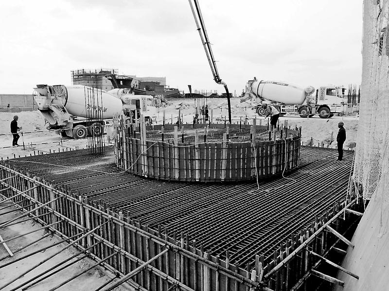 4月15日下午,經過前期近一個月的施工,晉南熱電公司工程脫硫環保項目#2吸收塔基礎完成開挖、鋼筋綁扎之后,開始混凝土澆筑。