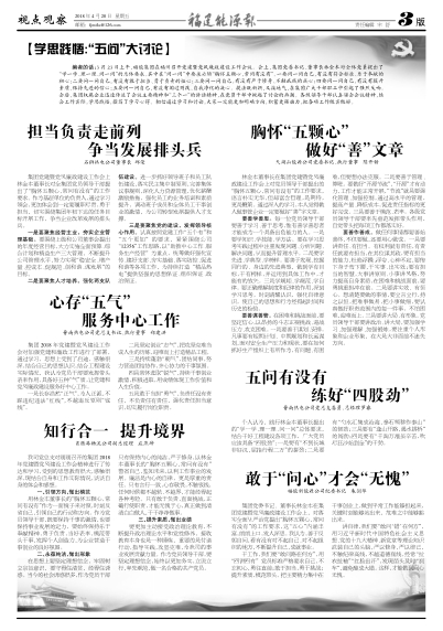 五是敢于當(dāng)擔(dān)“勇氣”,負(fù)責(zé)任沒有責(zé)任,不負(fù)責(zé)任有責(zé)任,強(qiáng)化責(zé)任擔(dān)當(dāng)意識(shí),切實(shí)履行崗位職責(zé)。