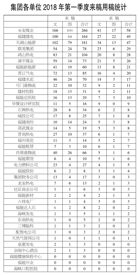 各單位2018年第一季度來稿用稿統(tǒng)計(jì)