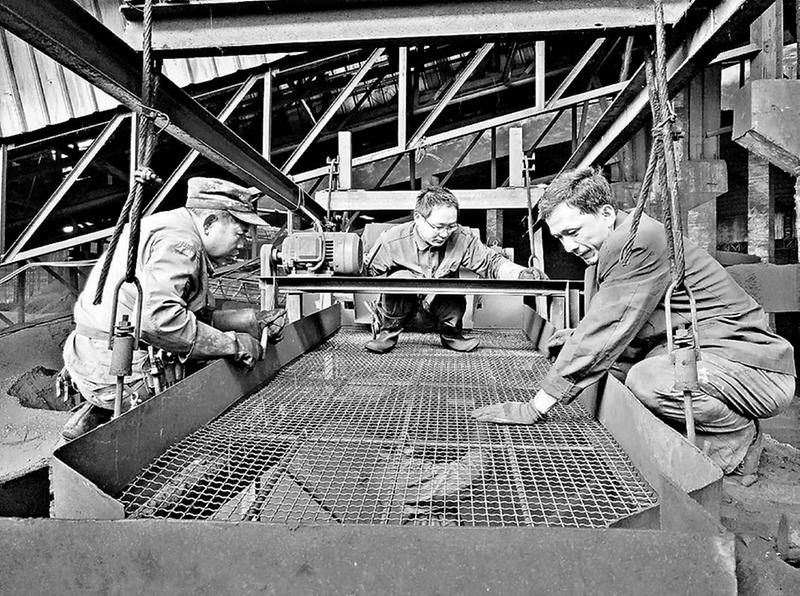 為加工出符合客戶所需求的煤炭顆粒度,福建煤電公司雁石發(fā)運站及時制作出相對應尺寸篩孔的篩網,確保篩出的煤炭粒度達標。圖為4月27日,該站機電人員在安裝新篩網。(鄭偉海攝)