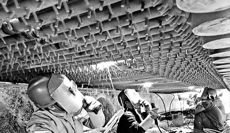 焊工們焊接水冷壁上部。 連日來的持續(xù)高溫,給晉南熱電工程施工帶來了不小的影響,卻沒有阻擋工程建設(shè)者馬不停蹄的腳步。