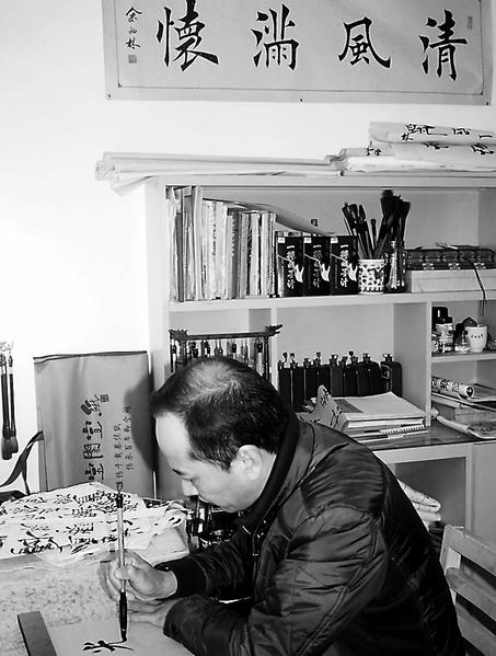 余德林說,學(xué)書法對(duì)他而言是一味受益終生的綠色食品。明年,他將退休了,放下了揚(yáng)鍬,他將把更多的時(shí)間放在手中的筆上,讓這個(gè)“綠色食品”滋養(yǎng)他的一生。(蘇明珍攝影報(bào)道)余德林在家中練字
