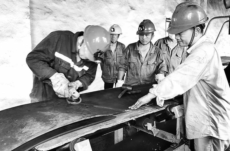 5月31日,石獅熱電公司4號輸煤皮帶接頭處被犁煤器磨損,需要及時搶修。輸煤檢修班接到搶修任務(wù)后,利用輸煤停運時間,做好皮帶接頭搶修工作。(謝志敏攝)