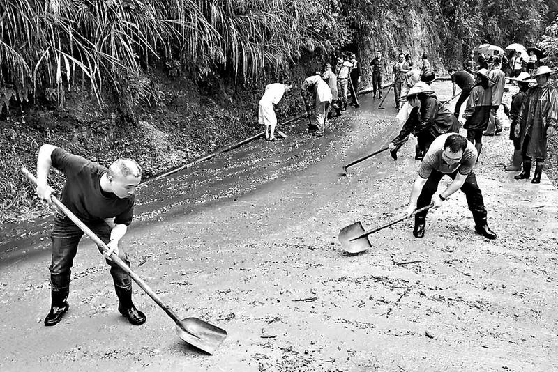 11時30分,在礦的黨員和管理人員陸續(xù)到井口集合后,曾慶偉進行了分工:“采煤隊長陳標云負責礦區(qū)路段清障的現(xiàn)場指揮,趁路面有流水,把樹枝、砂石清理干凈,加福篩選廠的鏟車隨后就到,配合一起清理。”