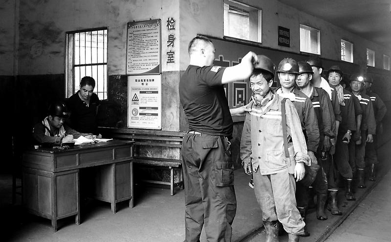 右圖:為了減少人為不安全因素,今年以來,永安煤業公司豐海煤礦進一步加強出入井人員的安檢工作。該礦對每一位出入井人員進行嚴格的檢身后還詳細記錄有關信息,確保無違規物品出入井及清點出入井人員準確無誤。(宋長敏攝)