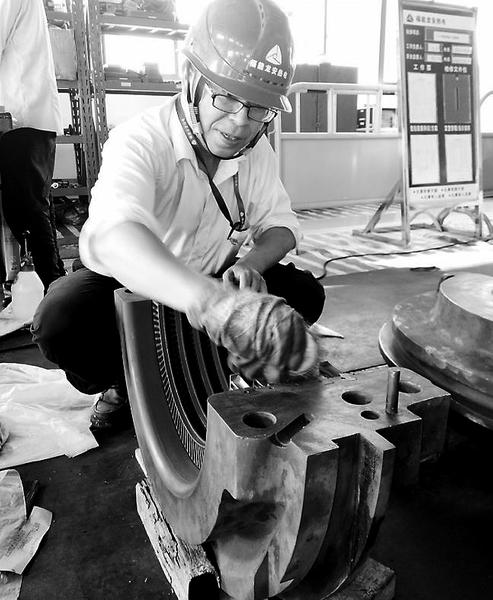 圖為歐陽連焱在現(xiàn)場清理葉片垢銹。 近日,龍安熱電1號機(jī)A級檢修正全面開展,發(fā)電機(jī)轉(zhuǎn)子從堂內(nèi)抽出,汽輪機(jī)動、靜葉片也解體吊離基座,各項(xiàng)檢查和試驗(yàn)正有序進(jìn)行,1號機(jī)A修已進(jìn)入攻堅(jiān)階段。黨員作為檢修部的中堅(jiān)力量,堅(jiān)持用習(xí)近平新時代中國特色社會主義思想武裝頭腦、指導(dǎo)實(shí)踐、推動工作,在1號機(jī)A修過程中充分發(fā)揮了先鋒模范作用。