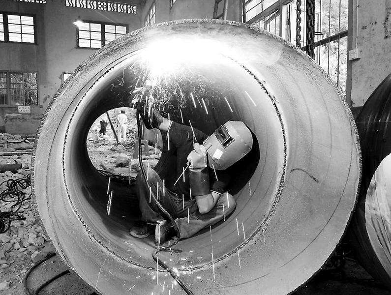 連日高溫,天湖山能源公司供電所蘇區(qū)坂水電站增效擴(kuò)容技改工作進(jìn)入了壓力管道安裝階段。圖為該電站職工在悶熱的車(chē)間管道內(nèi)焊接壓力管,確保技改工作順利完成。(林美祝陳素真攝影報(bào)道)