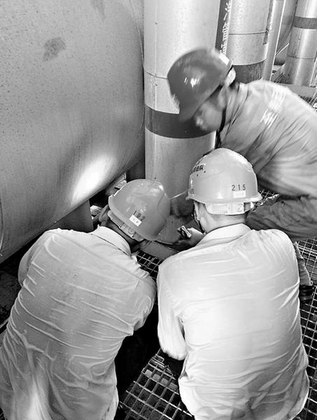 7月25日,晉江氣電公司#4機(jī)冷態(tài)啟動(dòng)升負(fù)荷階段,運(yùn)行人員在高溫下排查汽包排氣管道漏點(diǎn),用自己的“全濕背”保障機(jī)組正常運(yùn)行。(劉聿昕攝影報(bào)道)