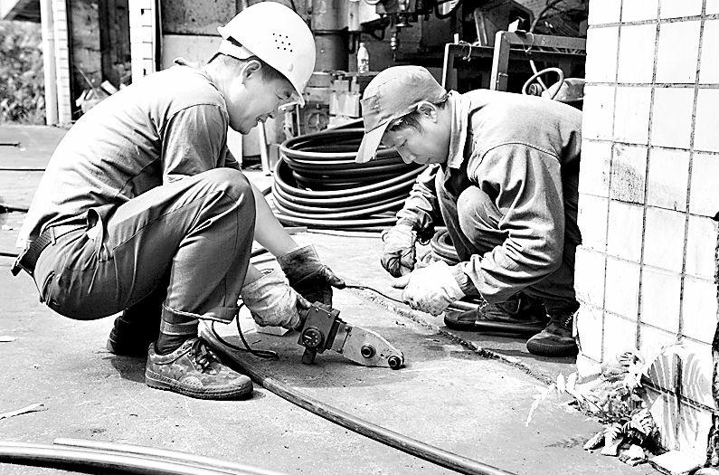 7月27日,太陽像個大火爐一樣烤著大地,一陣陣熱浪撲面而來。福建煤電公司坎市發運站機電人員頂著烈日高溫天氣,更換該站破損的排水管道。圖為該站人員作業現場。