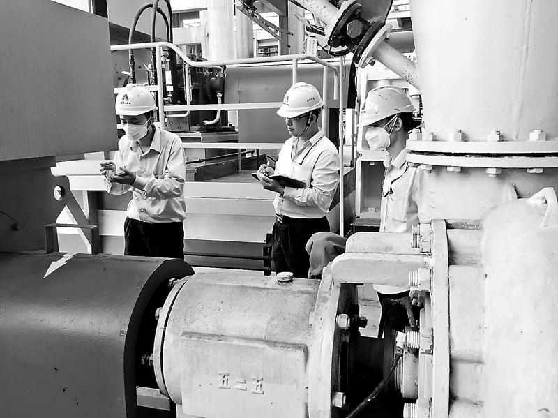 8月11日,鴻山熱電公司運行D值黨支部開展黨建+助力迎峰度夏活動。圖為黨員在車間檢查并記錄安全隱患。(吳開錢攝影報道)