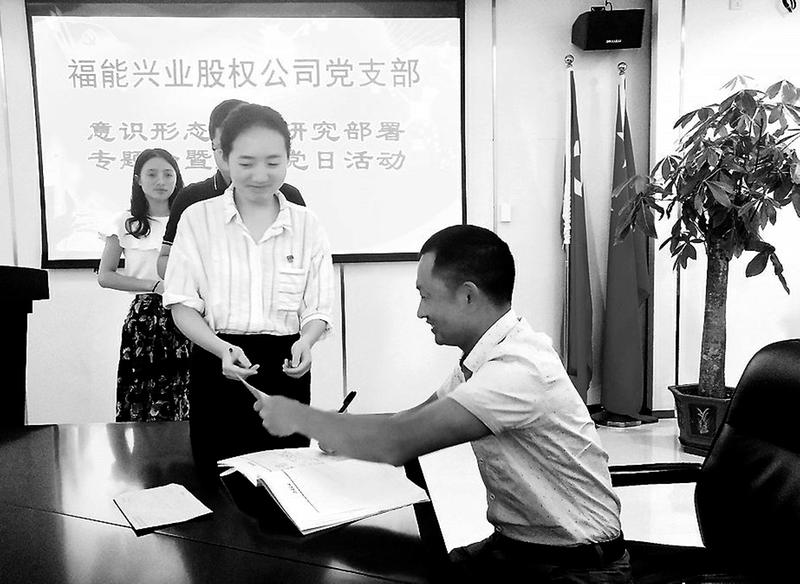 8月17日,福能興業(yè)股權(quán)公司開展主題黨日活動(dòng),黨員現(xiàn)場(chǎng)繳交黨費(fèi)并由專人登記。