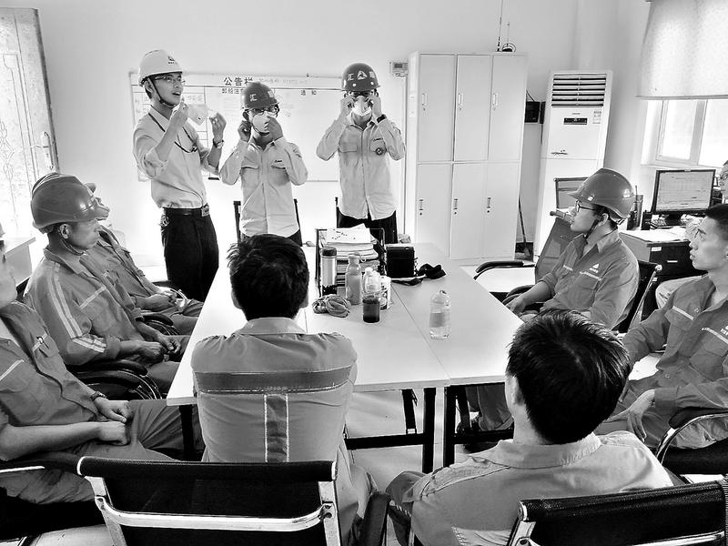 為進一步促進員工的安全防范意識,了解勞動防護用品的使用,月23日上午,肖厝港物流公司駐鴻山項目部結合各崗位實際情況,組織現場作業人員學習勞動防護用品的使用。圖為作業人員在學習口罩的正確佩戴方式。(黃志強攝影報道)