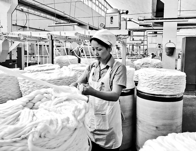 圖為吳鳳嬌正在檢查產品質量。 一條條或粗或細的紗線,隨著設備運轉來回運動著,漸漸形成了一排排被緊密而又有規律的紋路包圍的棉條。一位身著藍色工作服的女工正在工作通道上認真巡視,頭發整整齊齊地攏進一頂白色的小圓帽里,戴著口罩,系著圍裙,口袋里時刻放著一根包卷針和一本寫得密密麻麻的筆記本。她就是吳鳳嬌,南紡公司紡織廠生產調度兼操作質量守關員。
