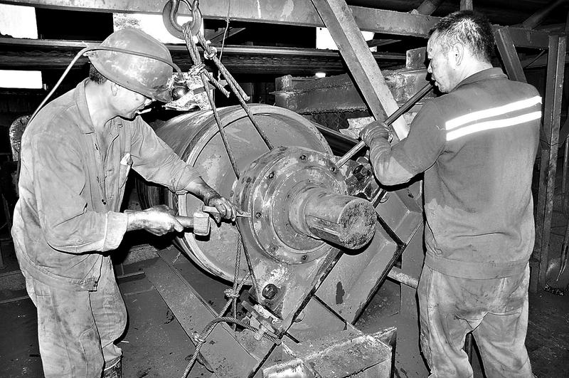 8月30日下午,永安煤業(yè)公司豐海煤礦1號皮帶機頭驅(qū)動滾筒軸承損壞,為了確保原煤運輸,該礦機運隊立即組織人員進行搶修。圖為工作人員正在拆除軸承端蓋。