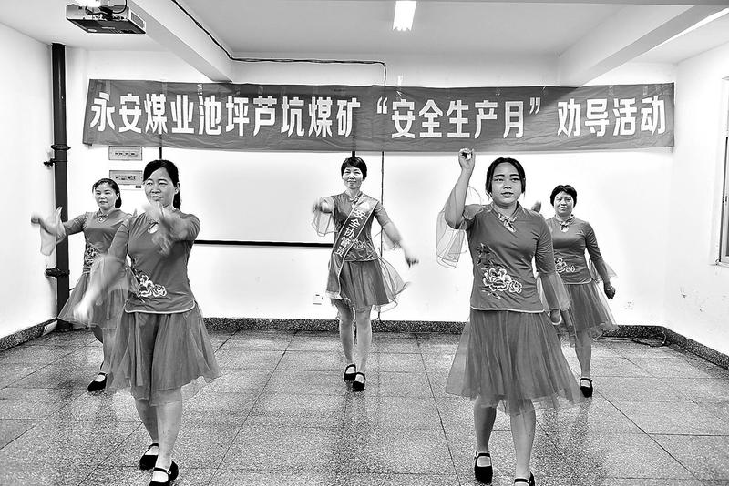 林鋒還組織了工網(wǎng)上教育”“養(yǎng)生課堂等活動,大大豐富了礦工們的業(yè)余生活。另外,她結(jié)合礦里每周一次的安全培訓,穿插開展一些安全大討林鋒(中)在“安全生產(chǎn)月”勸導活動上表演舞蹈。
