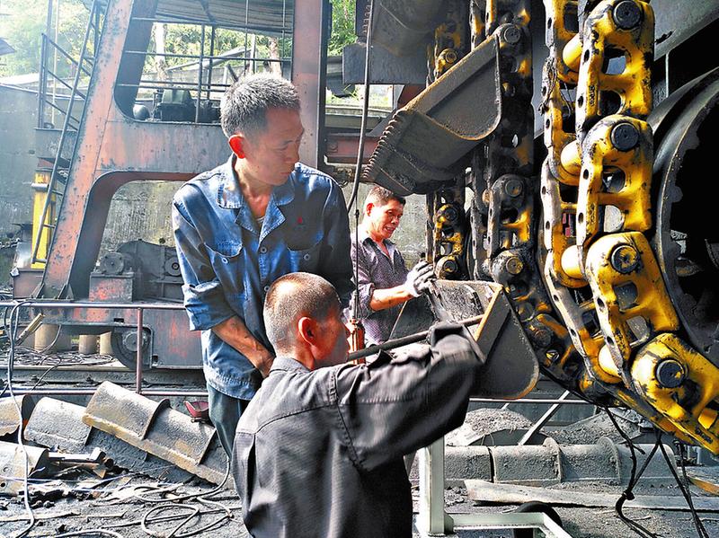 進(jìn)入三季度,福建煤電公司雁石發(fā)運(yùn)站卸煤任務(wù)大幅度增加,導(dǎo)致卸煤機(jī)運(yùn)行呈現(xiàn)出“疲態(tài)”。針對此情況,該站利用近期卸煤任務(wù)相對較少的有利時(shí)機(jī),對卸煤機(jī)實(shí)施“大檢修”,確保設(shè)備正常運(yùn)轉(zhuǎn)。圖為9月7日,該站機(jī)電人員在更換卸煤機(jī)鏈斗。(鄭偉海攝影報(bào)道)