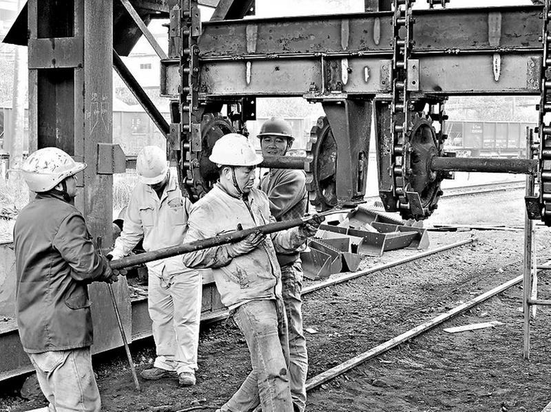 吃飯完后大家又立刻投入工作,修補(bǔ)機(jī)架的兩位焊工,一位舞動著割槍忙著下材料,一位半蹲在卸車機(jī)下的腳手架上,一刻不停地焊接著卸車機(jī)架腐爛件。整個現(xiàn)場割槍的火焰與焊把的焊花交相輝映,拼接鏈條的扳手與鏈條的碰撞聲叮當(dāng)清脆。冬月的夜來得特別早,不知不覺已是晚上10點,大家一邊收拾著工具,一邊互相提醒著明天早一點過來。