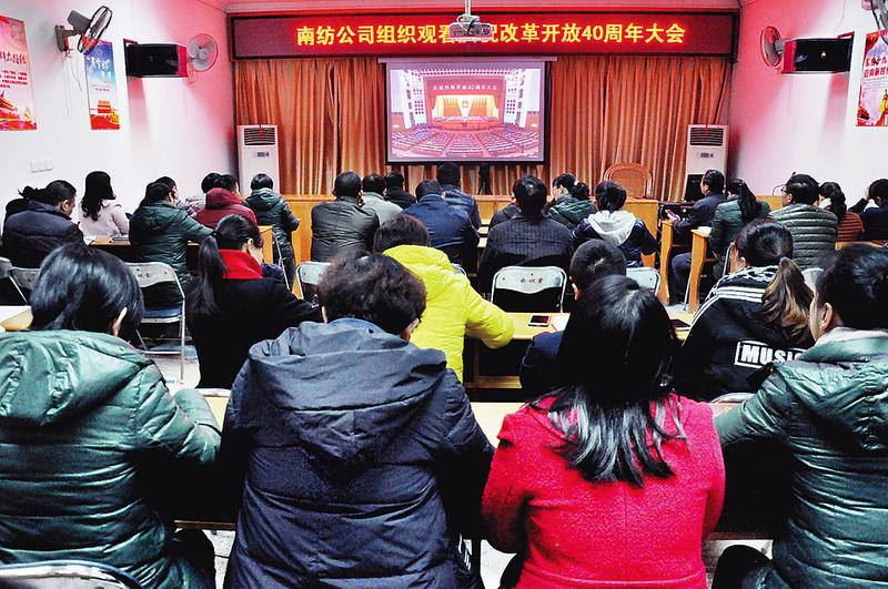 12月18日上午,慶祝改革開放40周年大會(huì)在北京人民大會(huì)堂隆重舉行。中共中央總書記、國(guó)家主席、中央軍委主席習(xí)近平在大會(huì)上發(fā)表重要講話。福能集團(tuán)及各權(quán)屬企業(yè)黨委認(rèn)真組織黨員、干部職工收看了大會(huì)直播實(shí)況,感受改革開放給偉大祖國(guó)帶來的翻天覆地的變化。圖為南紡公司干部職工在收看大會(huì)直播實(shí)況。
