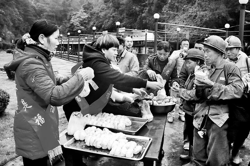 1月1日清晨6時許,在永安煤業(yè)公司柯坑煤礦井口,女工協(xié)管員在女工委主任鄭艷冬的帶領下,為準備下井的職工送上節(jié)日的慰問:熱氣騰騰的包子、剛出鍋的肉片湯、溫馨的安全祝福。 (陳君英/文張志良/圖)