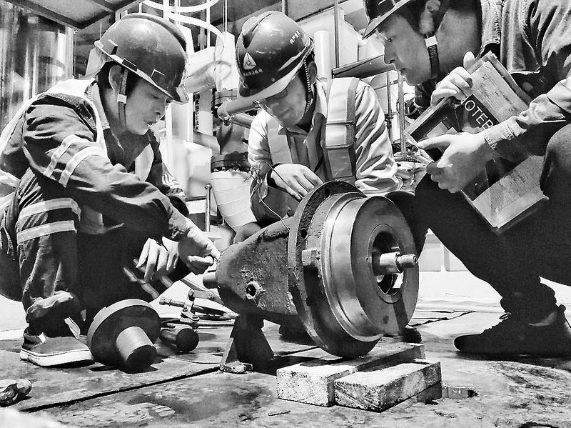 鴻山熱電公司2019年度機(jī)組檢修工作正在如火如荼地開展中。圖為2018年12月29日,在定冷水泵解體檢修現(xiàn)場(chǎng),該公司檢修人員正在對(duì)泵軸進(jìn)行檢查。(張維明/圖魯春蘭/文)