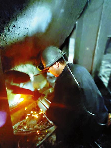 進(jìn)入年底檢修期,福建煤電公司翠屏山礦按照節(jié)前檢修計劃,有序開展設(shè)備檢修工作。圖為1月21日上午,機(jī)電工作人員對該礦主皮帶機(jī)下料非標(biāo)進(jìn)行修復(fù)。