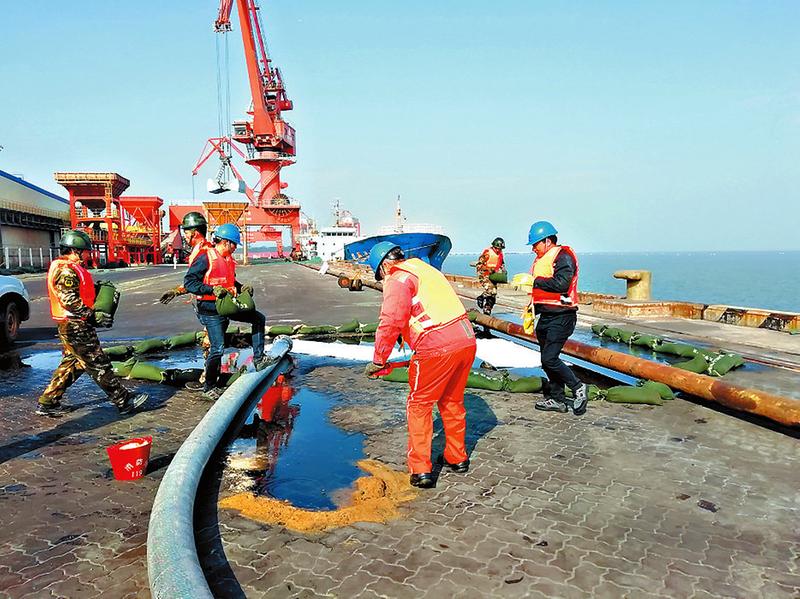 1月22日,由福建省湄洲灣港口管理局主辦、肖厝港務站協(xié)辦,肖厝港公司、泉州福海糧油工業(yè)有限公司聯(lián)合承辦的福建省湄洲灣港2019年危險貨物泄漏事故應急演習在南岸肖厝港區(qū)舉行。圖為現(xiàn)場人員在控制泄漏物漫延。(顏偉政攝影報道)