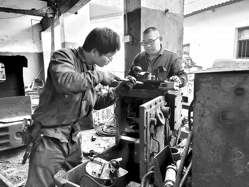 33月18日上午,福建煤電公司翠屏山煤礦井下一臺(tái)故障的22.55噸電瓶車被緊急送至地面維修車間,機(jī)修人員第一時(shí)間進(jìn)行故障排查。(黃桂丹 攝影報(bào)道)