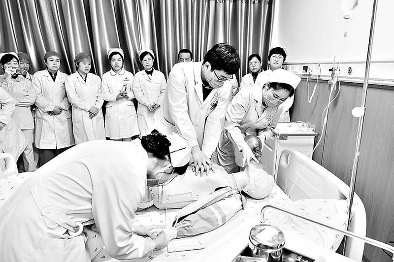 值班護(hù)士接到求救信號(hào)后,立即通知一線醫(yī)生、護(hù)士長(zhǎng)和其他護(hù)士到達(dá)病房實(shí)施搶救。一線醫(yī)生趕赴現(xiàn)場(chǎng)對(duì)“患者”病情進(jìn)行初判,判定為失血性休克并立即實(shí)施心肺復(fù)蘇進(jìn)行搶救。二線醫(yī)生、科主任、值班護(hù)士等攜搶救設(shè)備緊隨其后。在二線醫(yī)生的指揮下,大家各司其職,演練現(xiàn)場(chǎng)緊張、安靜、有序。