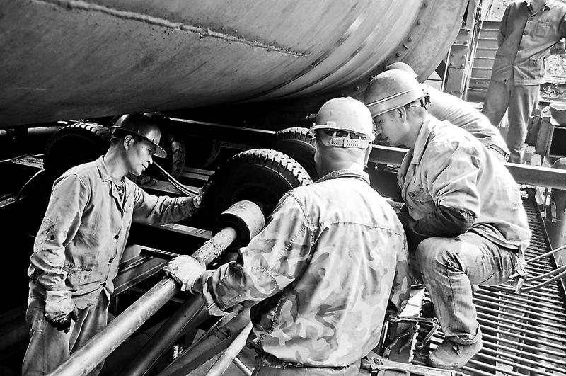 4月9日上午,永安煤業(yè)公司豐海篩選廠洗選滾筒傳動系統(tǒng)發(fā)生故障,機電技術(shù)工人及時將9噸重的螺旋滾筒整體起吊,搶修設(shè)備,排除故障,確保煤炭返篩配比生產(chǎn)正常。圖為該廠機電技術(shù)工人正在排除設(shè)備故障。(黃發(fā)灼攝影報道)