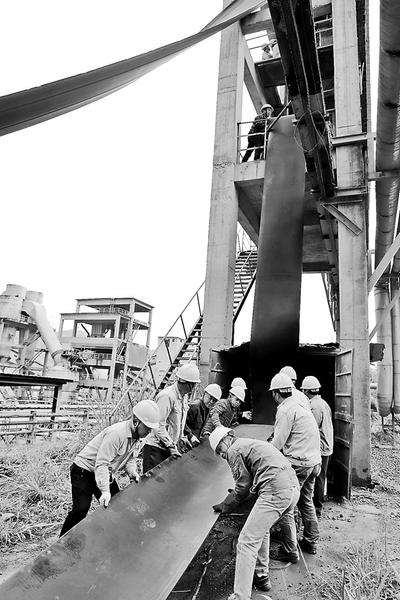 福建水泥煉石廠8#窯原料入磨35.14皮帶因年久磨損嚴(yán)重,易造成漏料。為了不影響正常生產(chǎn),該廠熟料分廠組織人員對35.14皮帶進(jìn)行更換。圖為4月15日上午,大家齊心協(xié)力將全長400多米、總重約6噸的皮帶助推輸送。(雷瓊攝影報道)