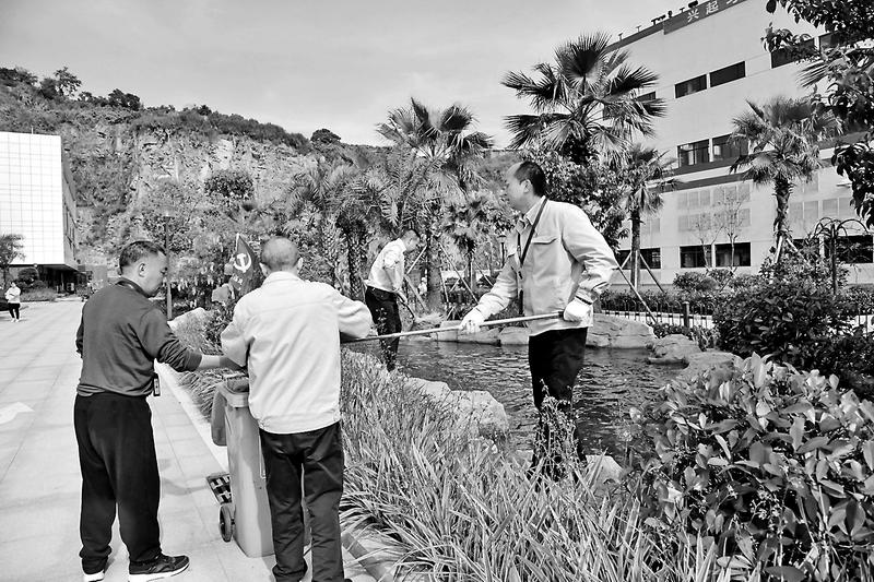 4月18日,龍安熱電公司黨總支組織黨員在廠區(qū)開(kāi)展了一次“愛(ài)家園、愛(ài)勞動(dòng)”的主題黨日活動(dòng)。圖為黨員在清理魚(yú)池內(nèi)雜物。(吳仙和 攝影報(bào)道)