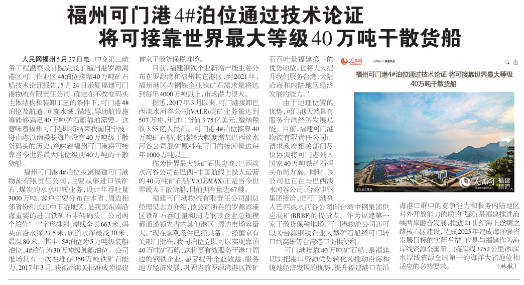 福州可門港4#泊位通過技術(shù)論證將可接靠世界最大等級40萬噸干散貨船