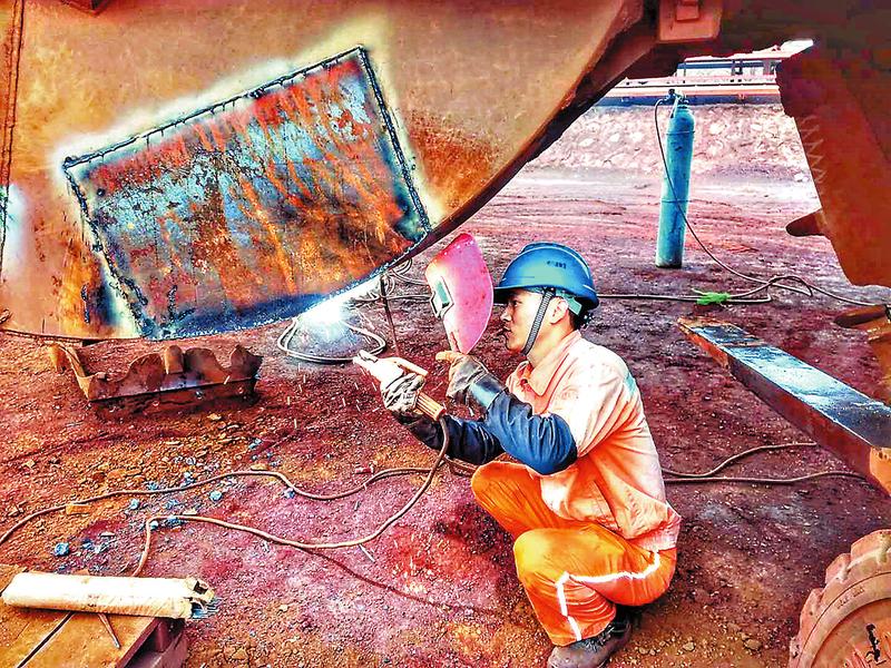 今年以來(lái),可門(mén)港物流公司技術(shù)設(shè)備部緊緊圍繞公司“降本增效”主線(xiàn),把修舊利廢、節(jié)能降耗、技術(shù)改造作為重點(diǎn)工作,鼓勵(lì)員工對(duì)廢棄的材料和設(shè)備進(jìn)行改造,提升設(shè)備的使用率。圖為近日,該公司技術(shù)設(shè)備部職工正對(duì)料斗易磨損的地方進(jìn)行堆焊處理。(葉智興攝影報(bào)道)